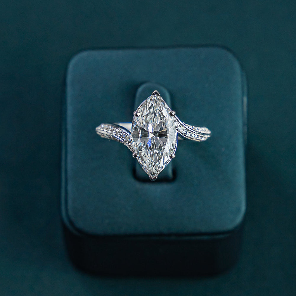 Crafted to captivate, the Ameera Marquise Twist Ring is a bold yet graceful expression of modern luxury. At its heart lies a striking marquise-cut lab-grown diamond, a centerpiece of unmatched brilliance and fire. Surrounding it, 99 pavé-set round diamonds flow along it's signature twisted band, adding layers of refined sparkle and softness.