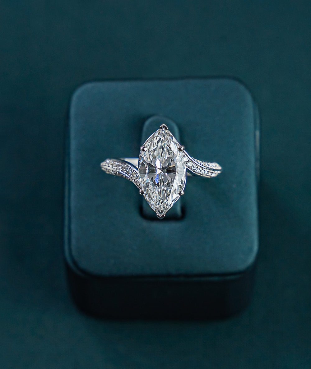 Crafted to captivate, the Ameera Marquise Twist Ring is a bold yet graceful expression of modern luxury. At its heart lies a striking marquise-cut lab-grown diamond, a centerpiece of unmatched brilliance and fire. Surrounding it, 99 pavé-set round diamonds flow along it's signature twisted band, adding layers of refined sparkle and softness.