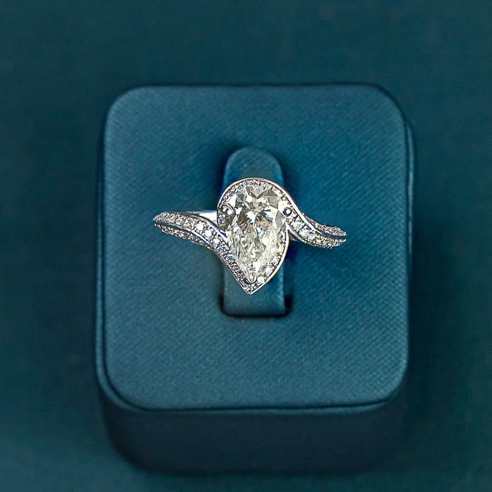 Crafted to captivate, the Ameera Pear Twist Ring is a bold yet graceful expression of modern luxury. At its heart lies a striking 1.5ct pear-cut lab-grown diamond, a centerpiece of unmatched brilliance and fire. Surrounding it, pavé-set round diamonds flow along it's signature twisted band, adding layers of refined sparkle and softness.