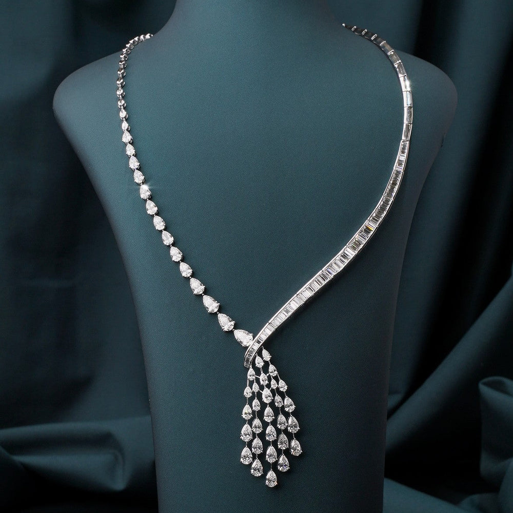 The asymmetric structure converges into a cascading cluster of pear-shaped diamond drops, creating beautiful movement and continuous sparkle with every turn. The contrast between soft curves and clean linear geometry gives the necklace a distinctly modern yet timeless presence.