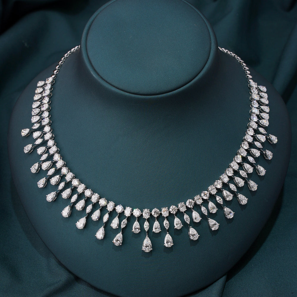 The design balances structure and softness — a polished diamond line at the neck gives way to a rhythmic fringe of teardrops, adding dimension, elegance, and dramatic presence without feeling heavy. Each stone is meticulously matched for proportion and fire, forming a seamless flow from shoulder to center.