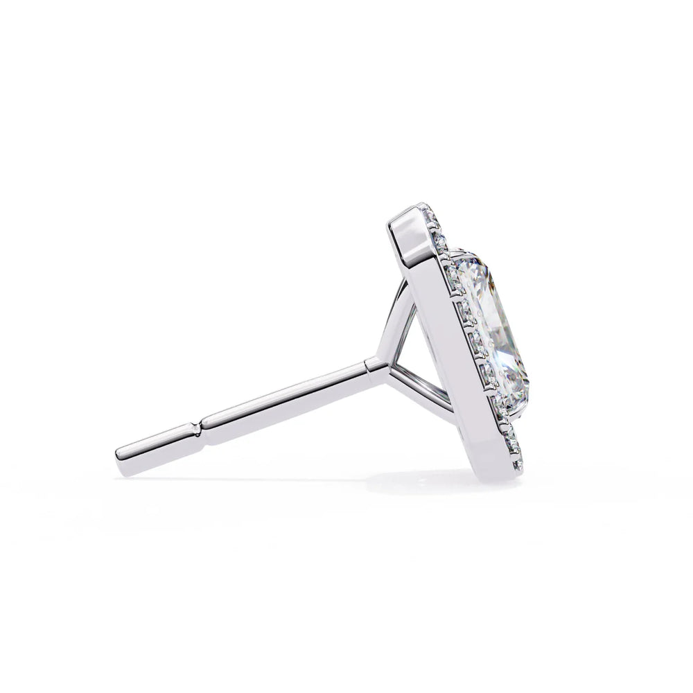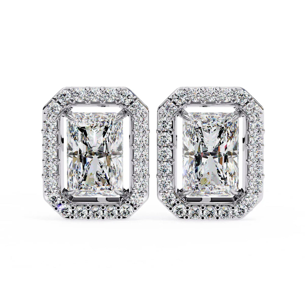 Bold and modern, the Royal Radiant Halo Studs highlight the vibrant fire of radiant-cut diamonds framed by a brilliant halo that enhances both structure and sparkle. The clean, architectural silhouette is elevated by the surrounding light-reflecting accents.