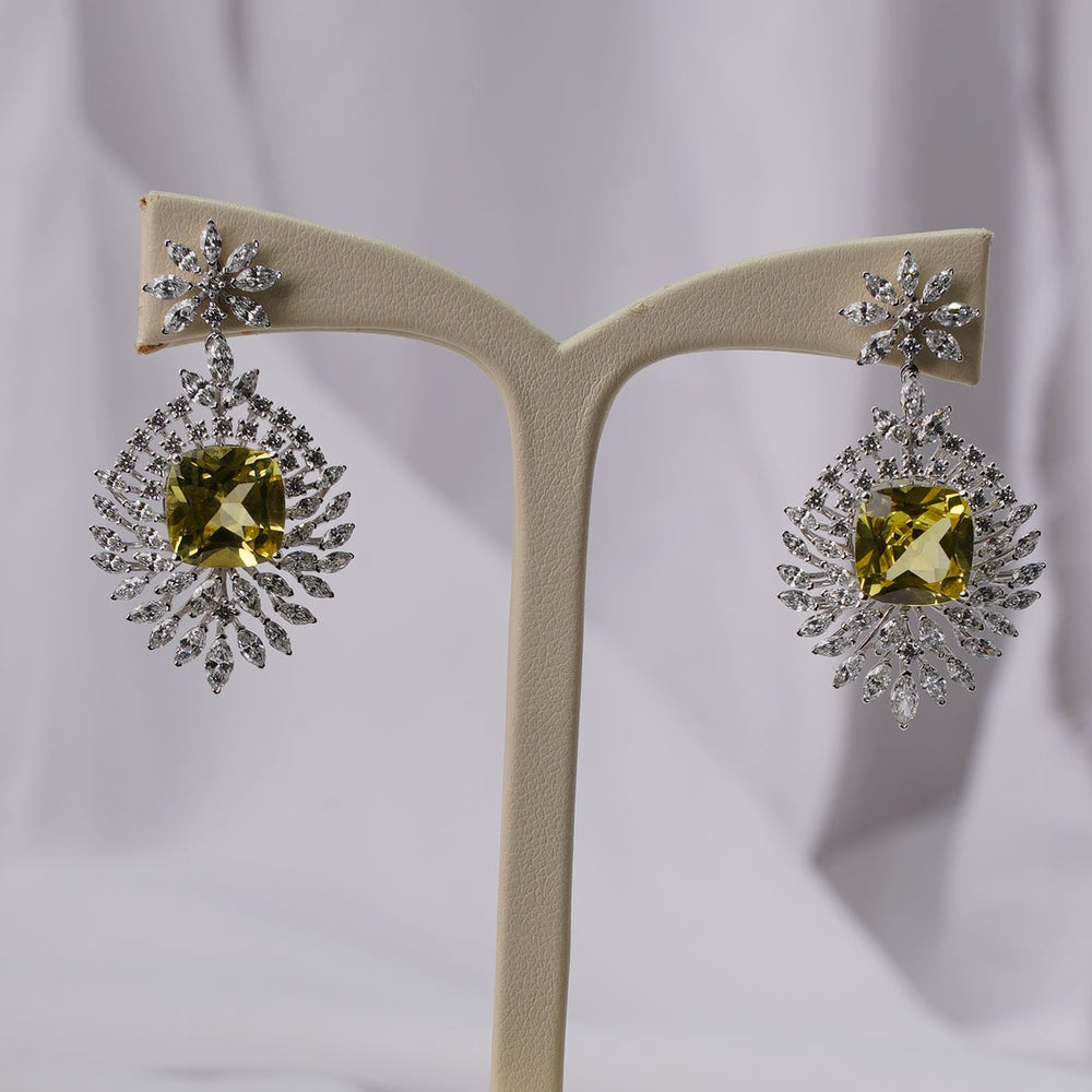 The Solara Sunflare Cushion Drops feature vivid yellow cushion-cut diamond centres framed by sculptural halos of marquise and round brilliant diamonds, totalling 14.27 carats. Designed to capture and release light from every angle, the layered sunburst setting creates a dramatic interplay of brilliance and warmth.