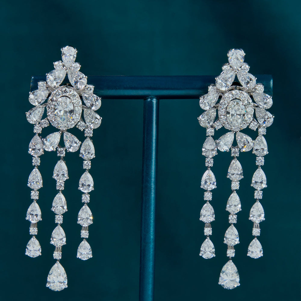 Designed for maximum light play, the layered arrangement allows each stone to shimmer independently while moving fluidly with the wearer. Opulent yet refined, these chandelier earrings evoke the grandeur of architectural spires and evening chandeliers — a bold statement piece crafted for galas, celebrations, and unforgettable entrances.