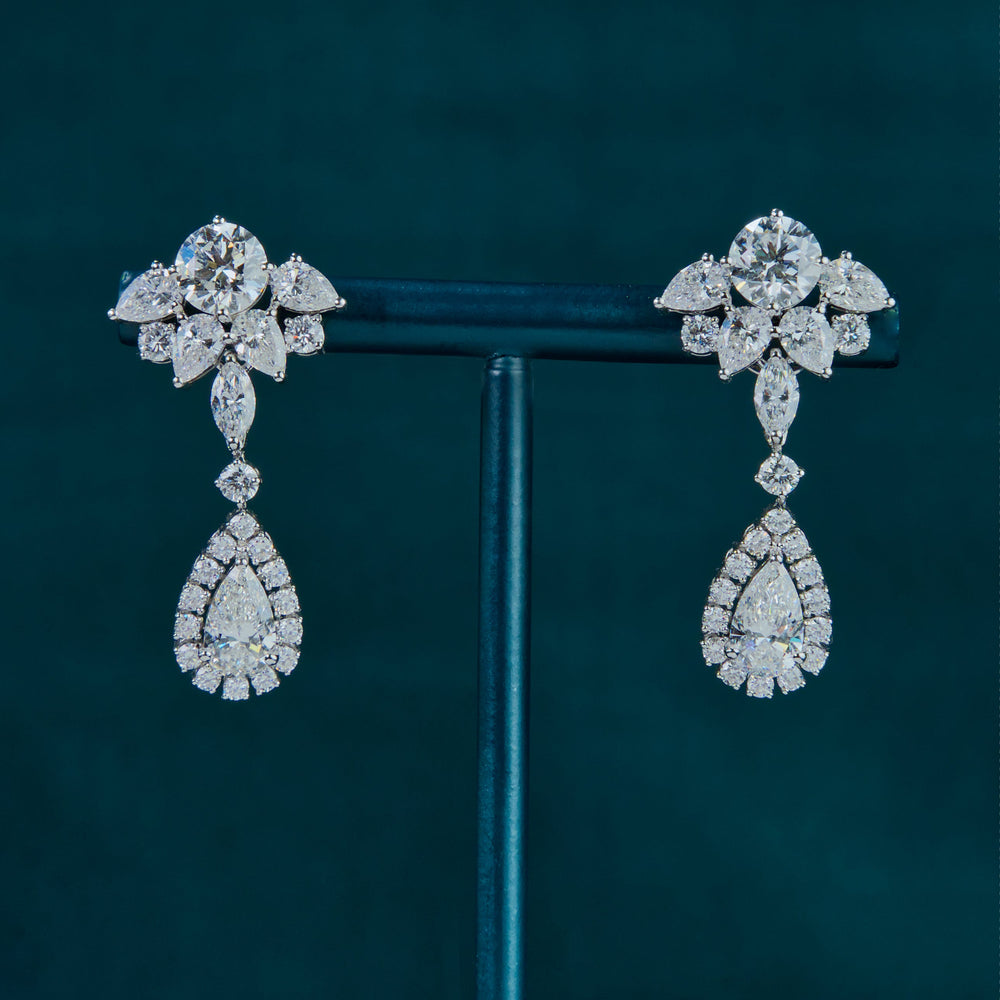 The layered composition creates depth, movement, and multidirectional sparkle, ensuring the earrings shimmer with every turn. Elegant yet statement-making, this design blends classic silhouettes with high-jewellery drama — perfect for weddings, celebrations, and evenings that call for unforgettable brilliance.