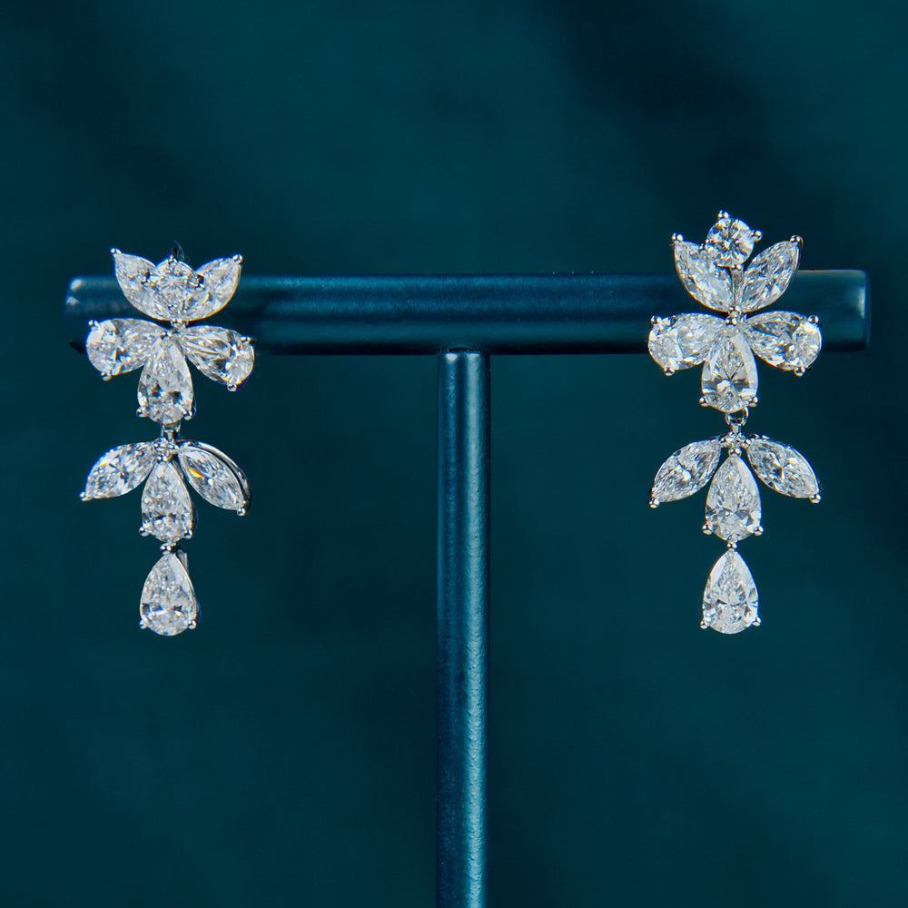 Elegant and delicate, The Caliora Drops feature marquise diamonds arranged in soft floral clusters that cascade into a graceful drop.