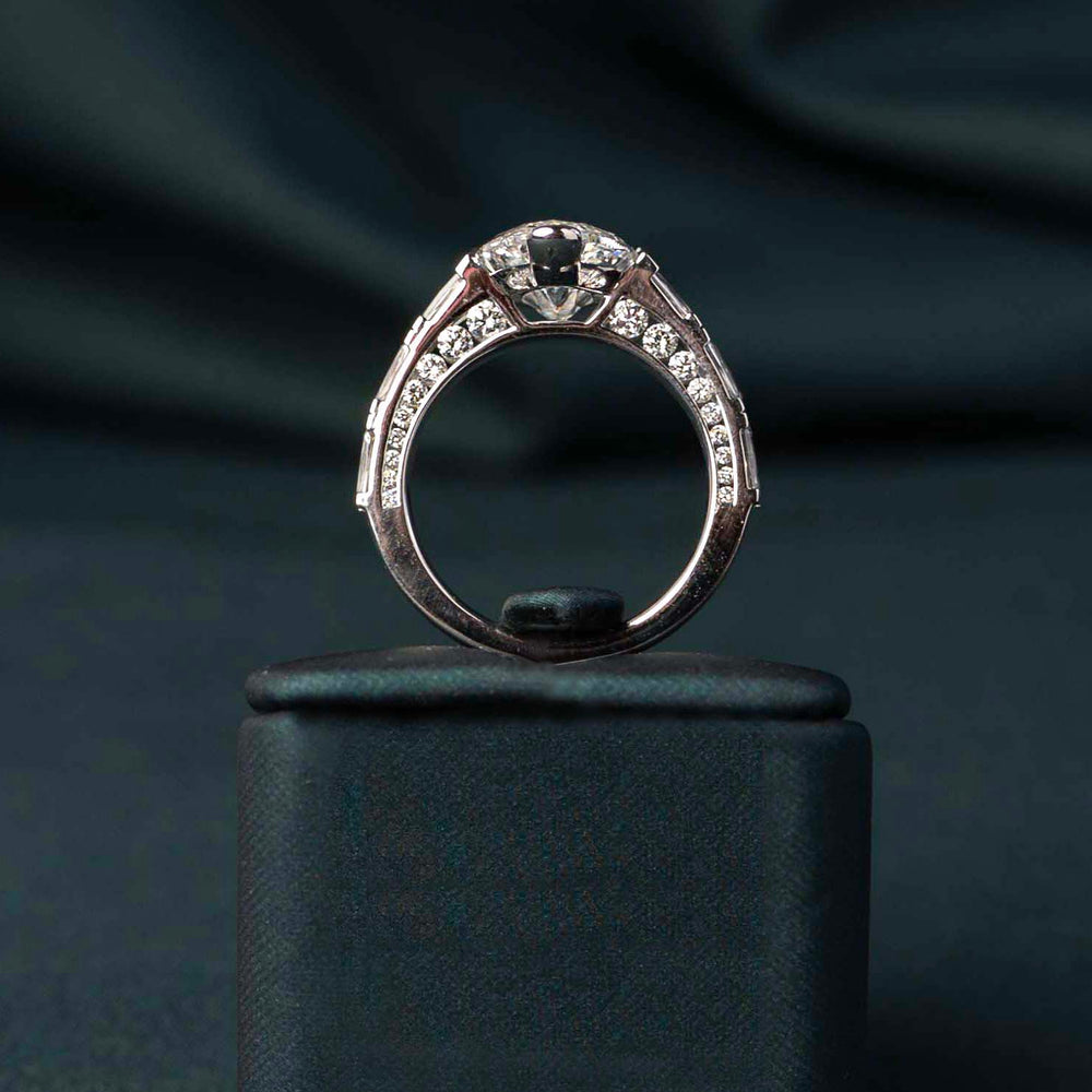 The Canopy Ring evokes sunlight filtering through layered branches above. A magnificent 5.7ct moval diamond sits at the center, surrounded by supporting stones that create depth, dimension, and luminous presence.