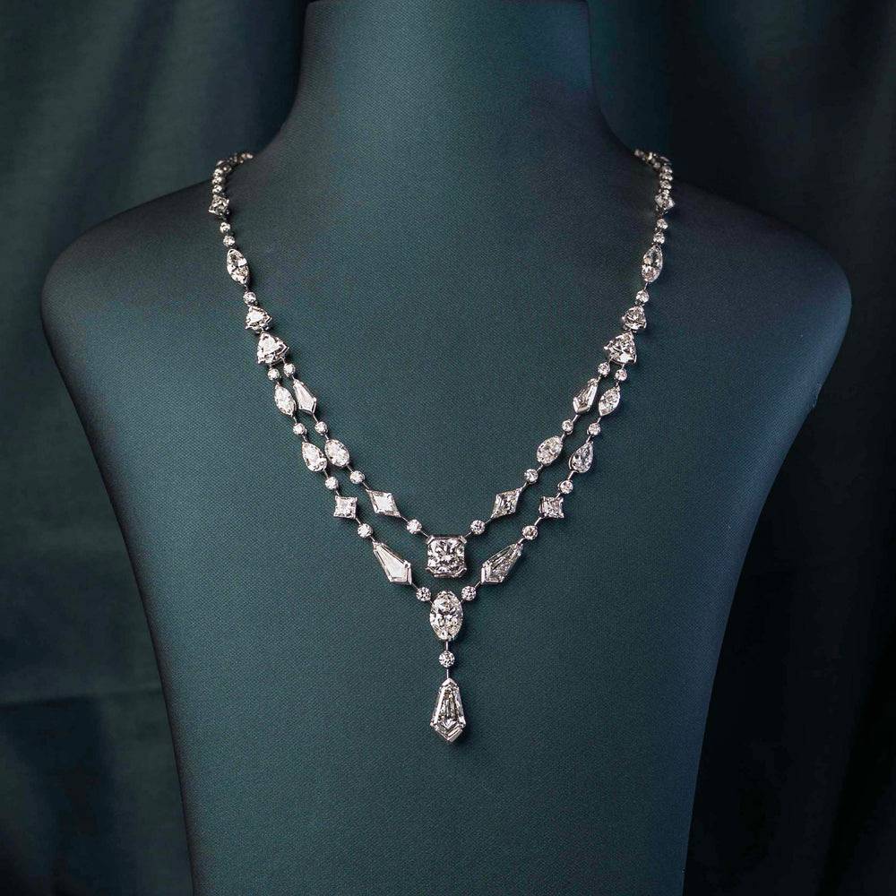 Layered diamond forms branch outward from a central focal stone, creating depth, rhythm, and quiet architectural drama. Sculptural yet fluid, it mirrors the structure of a living tree — rooted, balanced, and radiant.