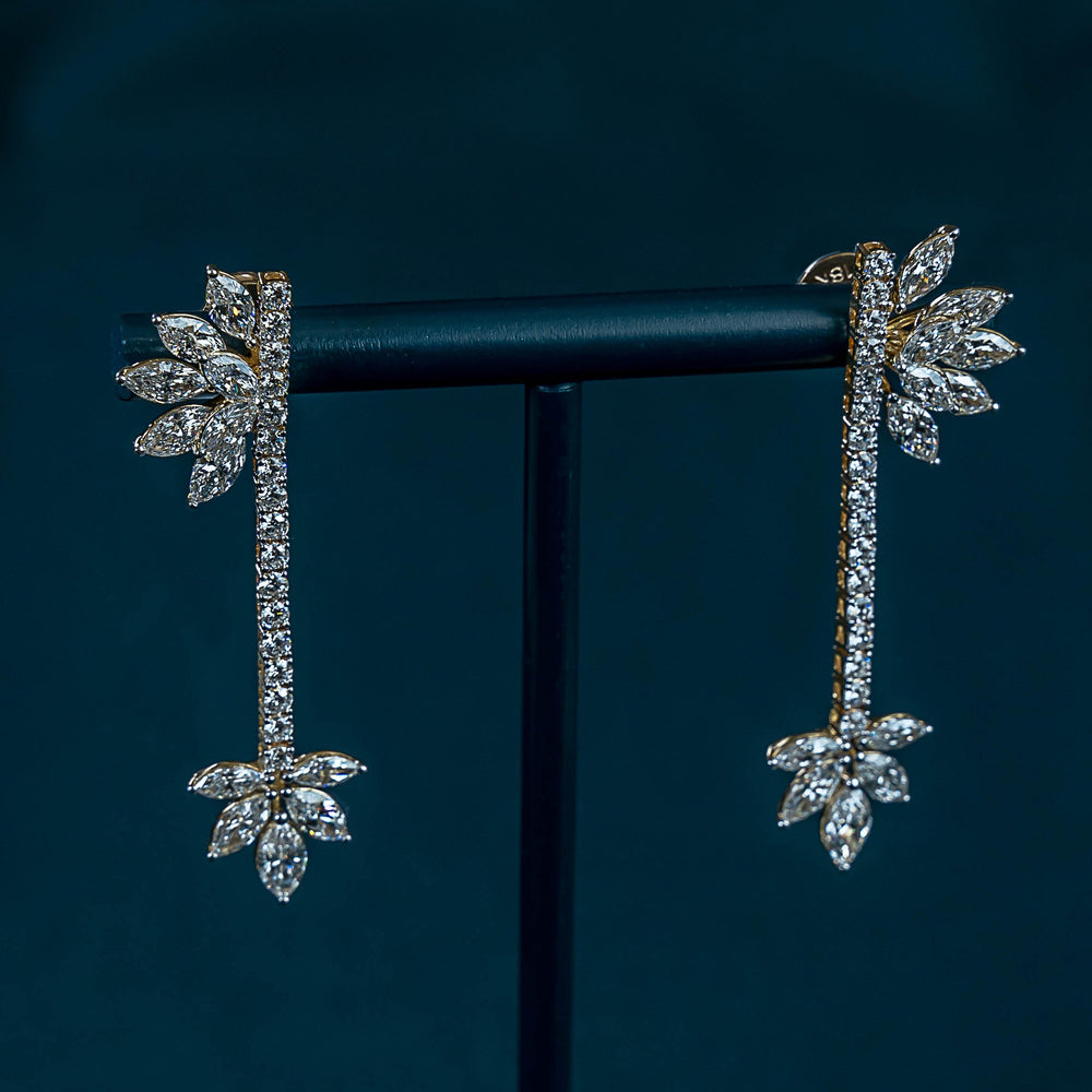 Modern and radiant, The Solis Drops feature brilliant diamond accents arranged in a sunburst-inspired design with a sleek vertical drop.