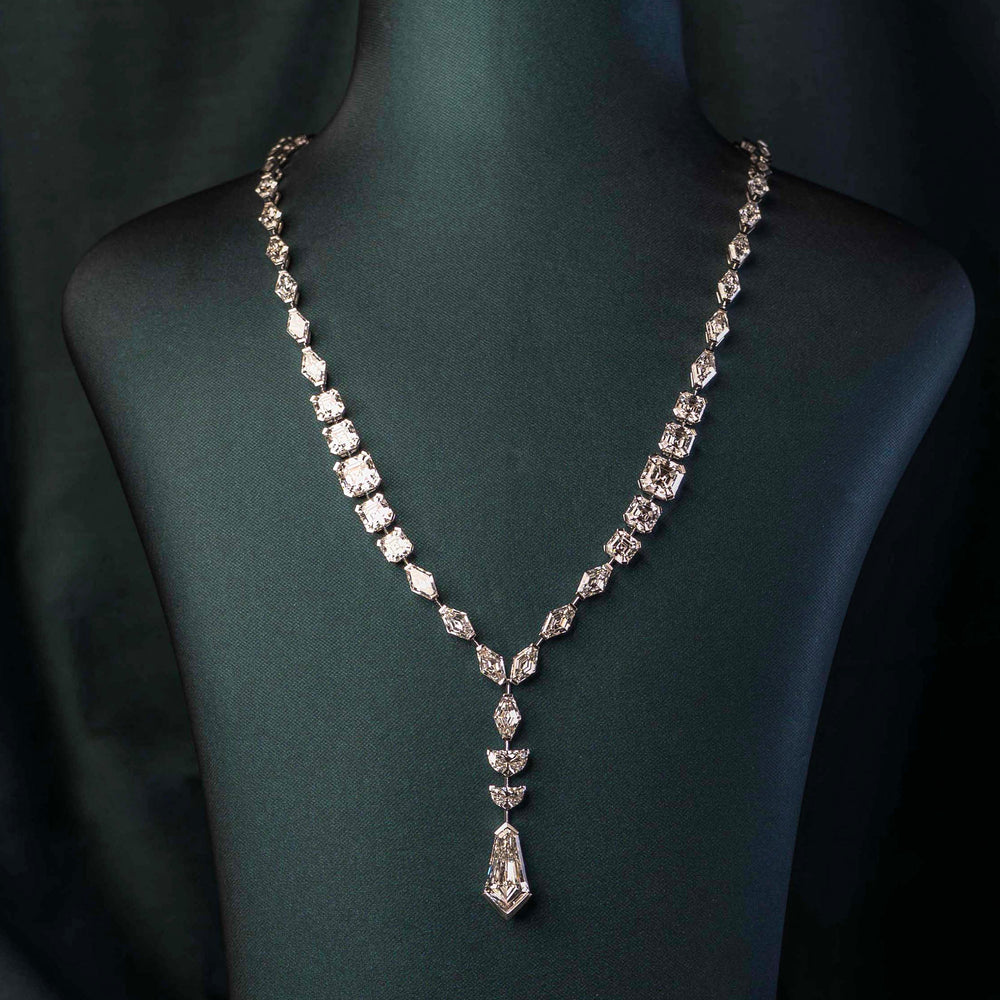 The centerpiece of the Walking Tree Collection and inspired by the vertical grace of towering trees, The Tallwood Necklace draws the eye downward in a rhythmic cascade of light. Graduated diamonds in unique cuts form a structured yet fluid composition, ending in a refined tie-cut drop that anchors the design.