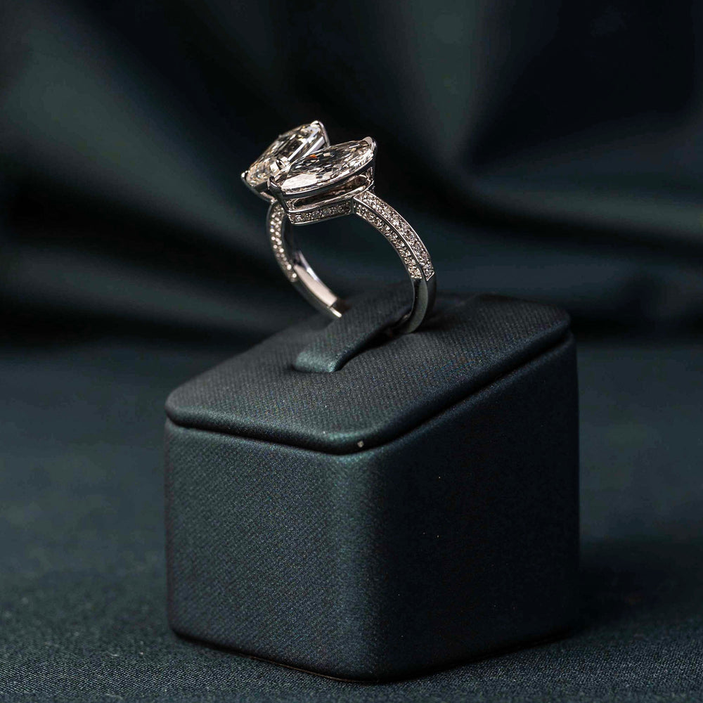 The Twin Leaves Ring mirrors nature’s symmetry through complementary diamond shapes. A 2.6ct emerald-cut and 1.7ct moval diamond sit in gentle opposition, like leaves shaped by the same branch yet uniquely distinct.