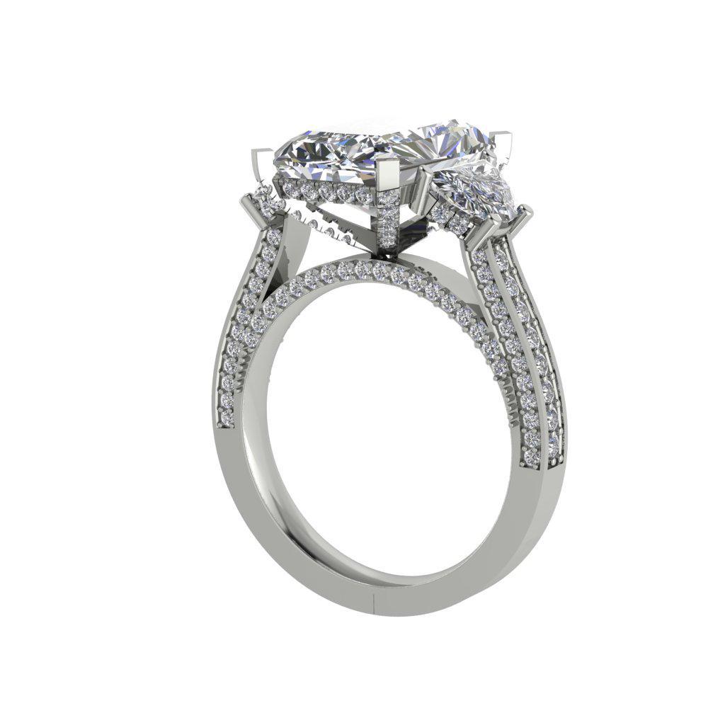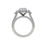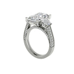 At its heart lies a breathtaking 5.00 ct fancy radiant-cut lab-grown diamond, certified F color and VS1 clarity — a true centerpiece of extraordinary fire and precision. Flanking it are two half-moon diamonds (1.00 ct total), delicately contoured to enhance the radiant’s grandeur and add a soft, sculpted symmetry to the trilogy design.
