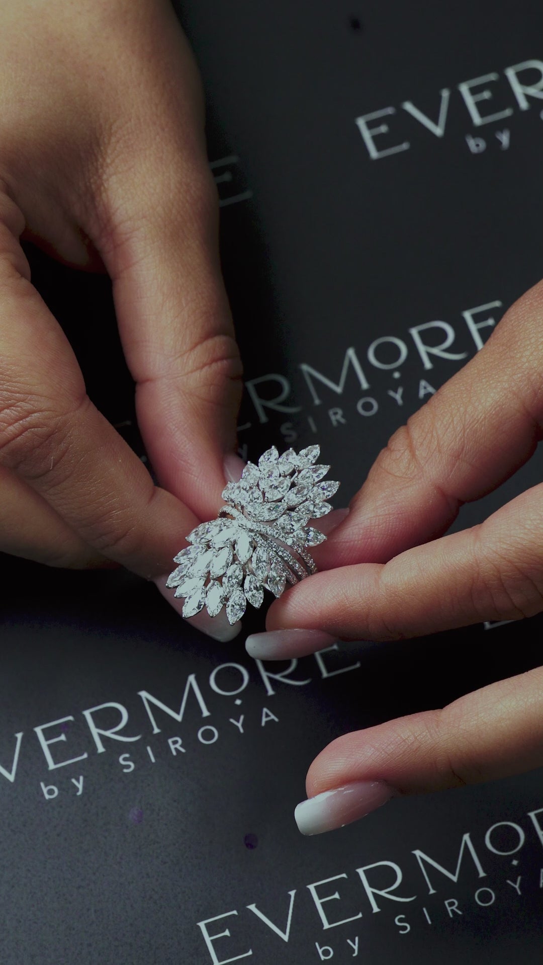 Inspired by the beauty of blossoming petals, the Astra Bloom Ring is a bold statement of floral symmetry and full-spectrum sparkle. Designed with 105 lab-grown diamonds — including marquise cuts that fan out into petal-like shapes and round diamonds clustered at the core — this 6.69 carat creation forms a powerful layered bloom that dazzles from every direction.