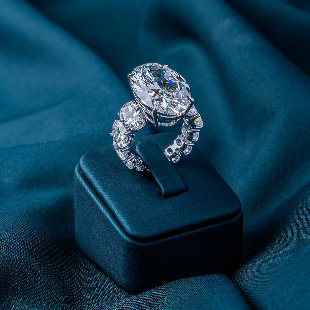 The Imperial Oval embodies authority through proportion and brilliance. At its center lies a commanding oval diamond, embraced by a harmonious arrangement of supporting stones that amplify its presence without distraction.