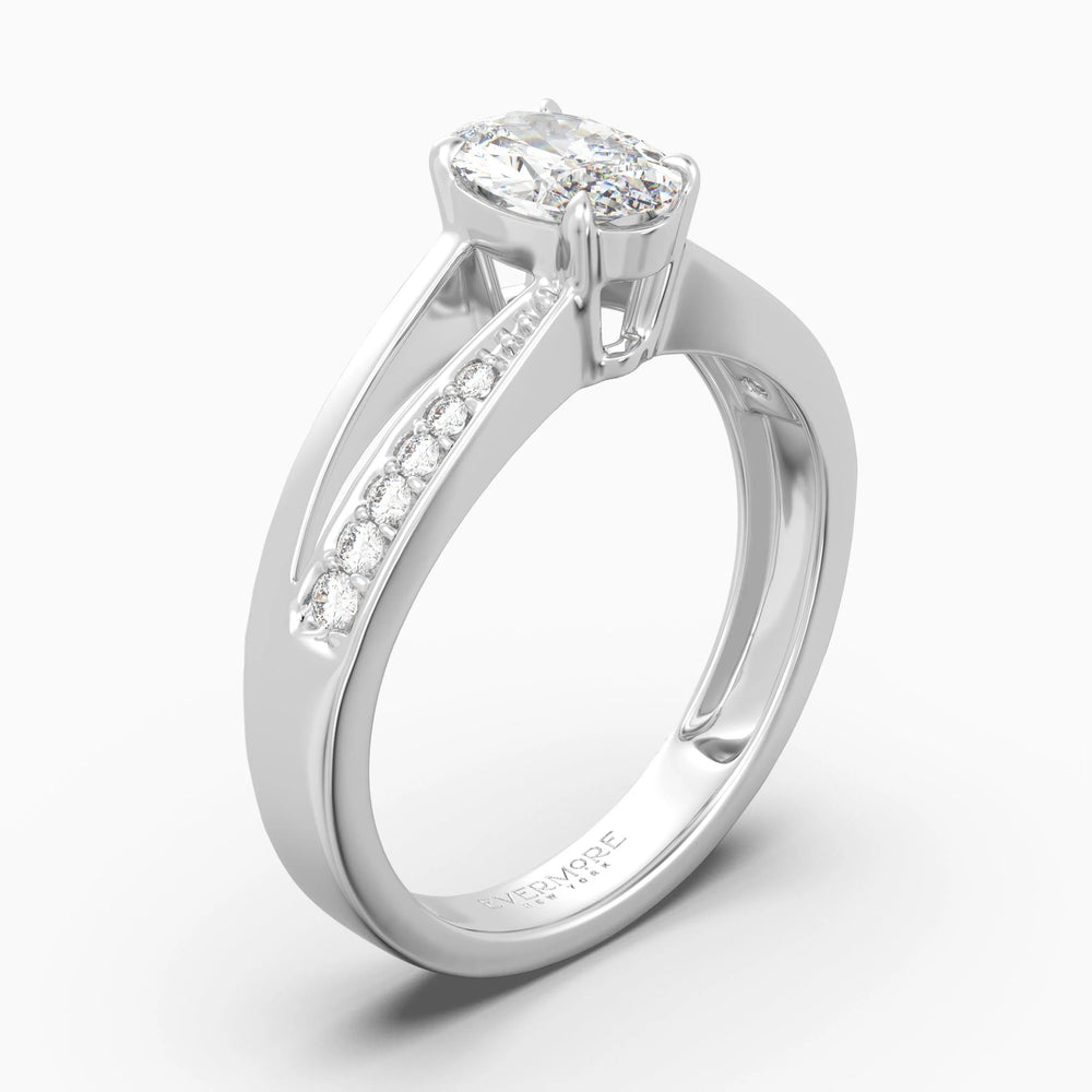 The Duet Oval Split Pave Diamond Ring is a contemporary symbol of harmony and elegance. Set with a captivating oval-cut lab-grown diamond at its center, the ring features a distinctive split shank — one side shimmering with a cascade of diamonds, the other left polished and bare for contrast.