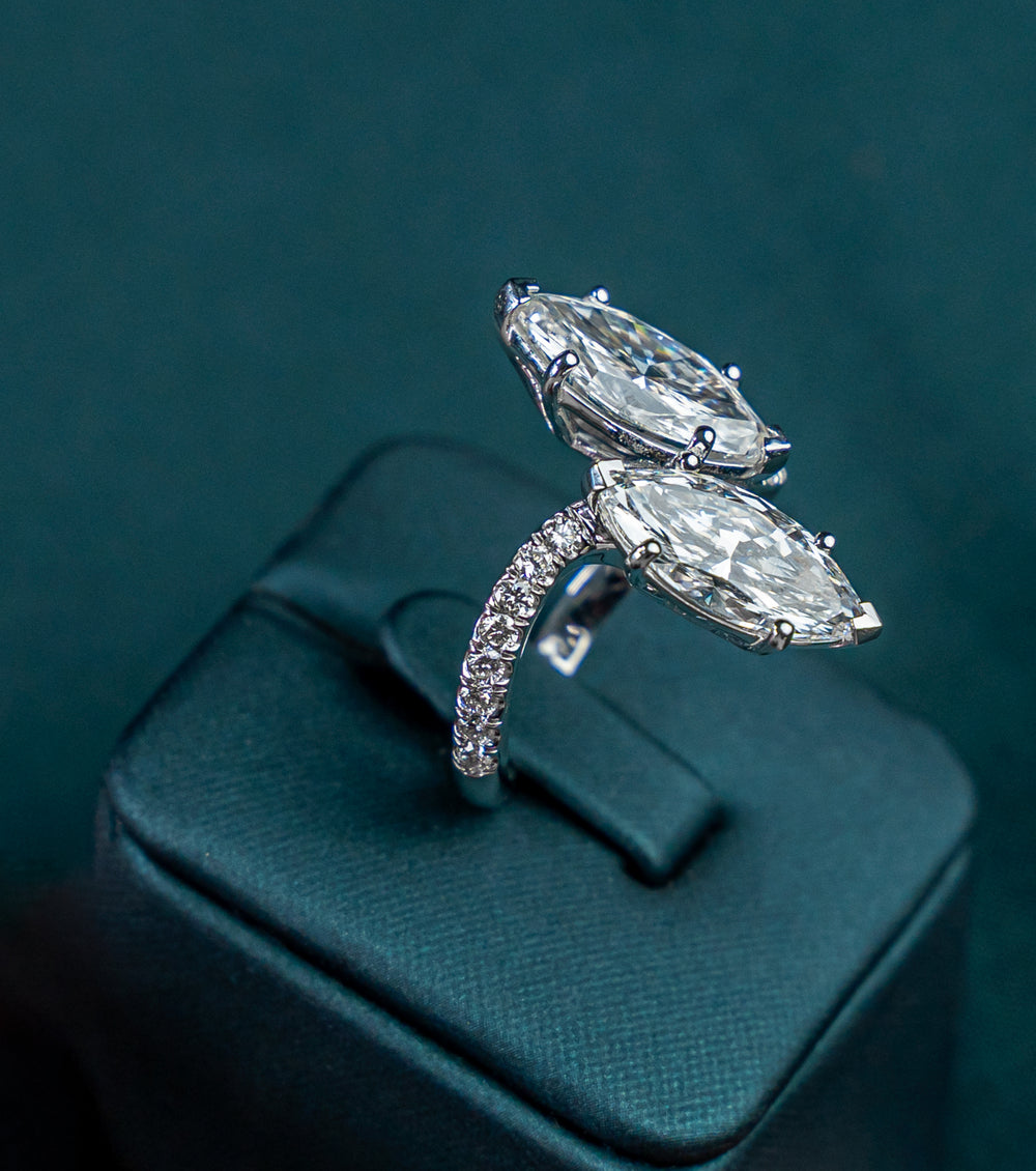 The gracefully curved band wraps around the finger with fluid movement, creating a contemporary, artistic profile that feels both dramatic and refined. Pavé-set diamonds along the band amplify the brilliance of the twin center stones, delivering sparkle from every angle while enhancing the ring’s luxurious, high-impact presence.
