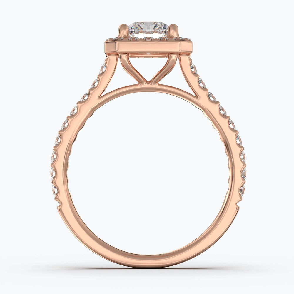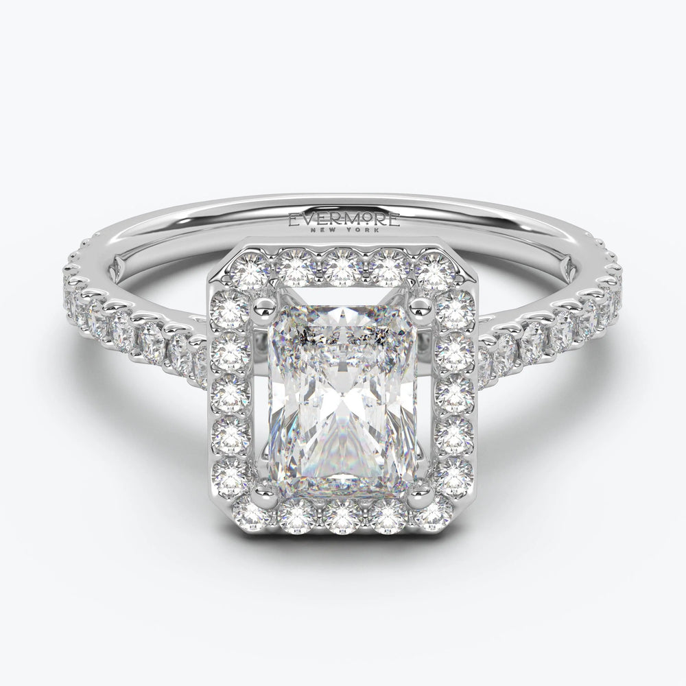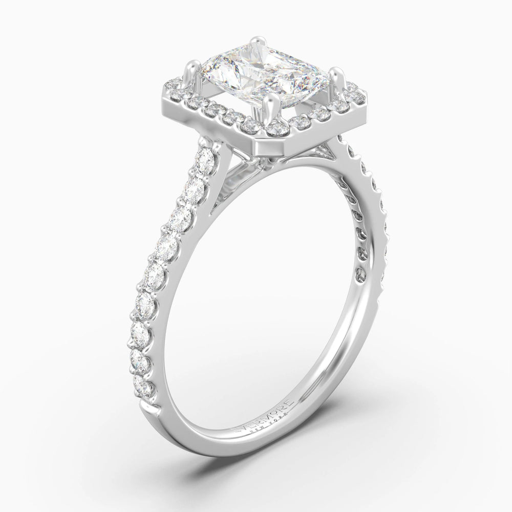 The Gabriel RadiantHalo rings feature a single cushion-cut diamond solitaire with a halo of smaller diamonds to enhance sparkle, and a diamond encrusted band which creates a refined view no matter which angle you view it from. The angular dimensions of the radiant cut diamond are perfectly framed to give you a structural and modern look, with a hint of old-world royalty.