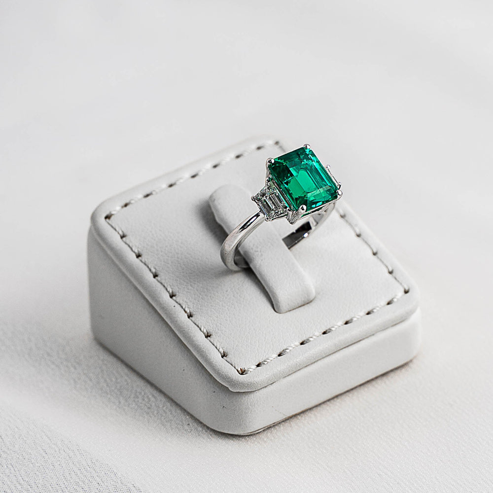 Elegant yet commanding, the Octavia Emerald Trilogy Ring features a vivid 4ct emerald center stone flanked by brilliant diamonds in a balanced, architectural design.