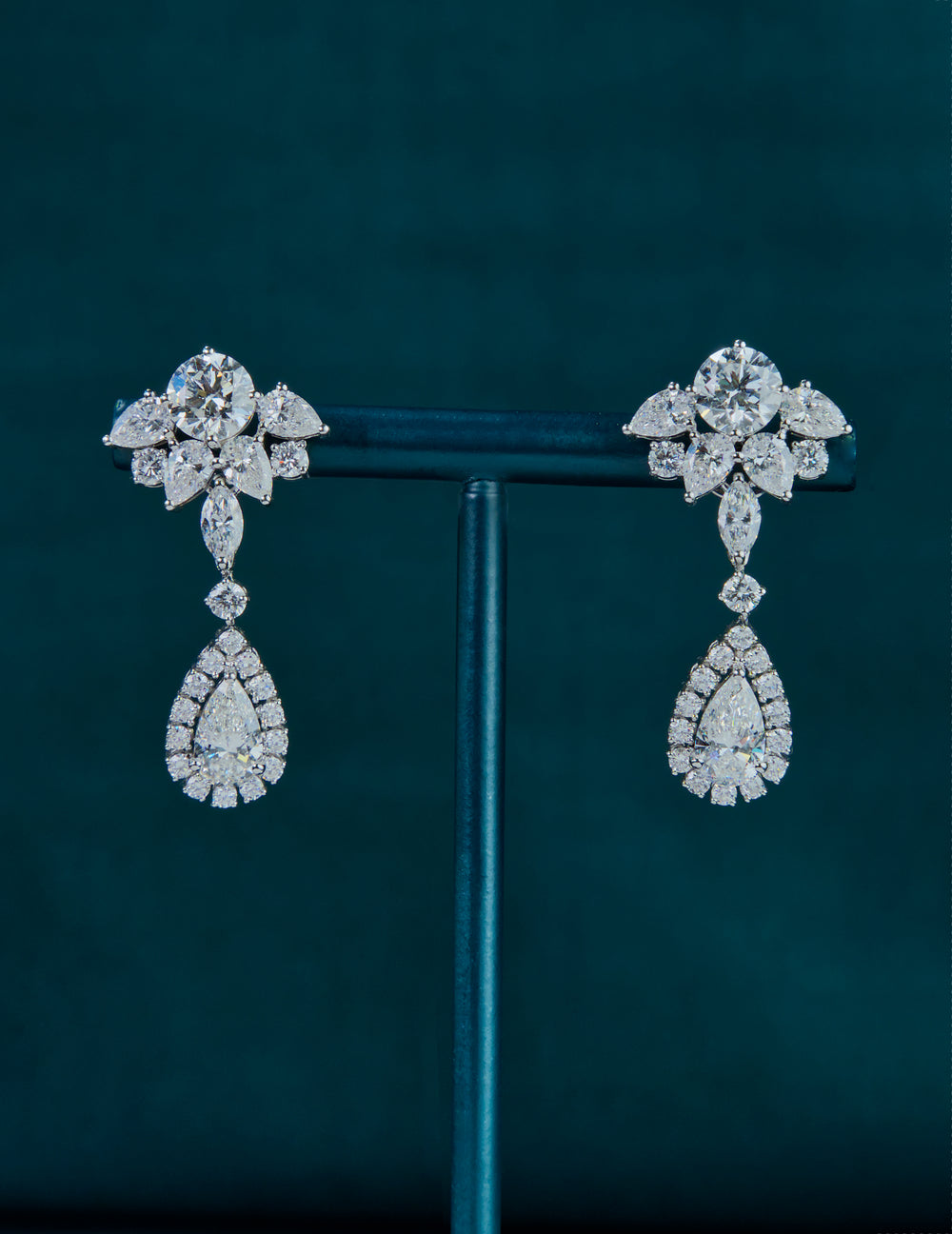 The layered composition creates depth, movement, and multidirectional sparkle, ensuring the earrings shimmer with every turn. Elegant yet statement-making, this design blends classic silhouettes with high-jewellery drama — perfect for weddings, celebrations, and evenings that call for unforgettable brilliance.