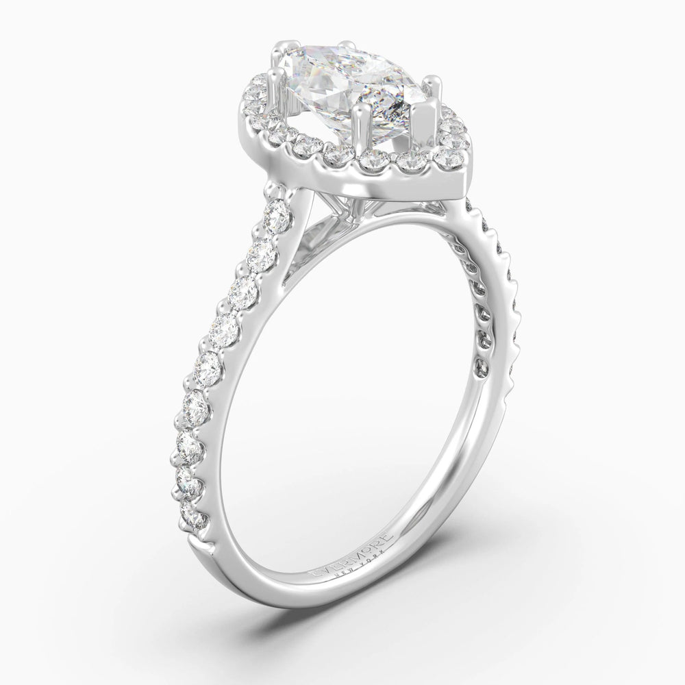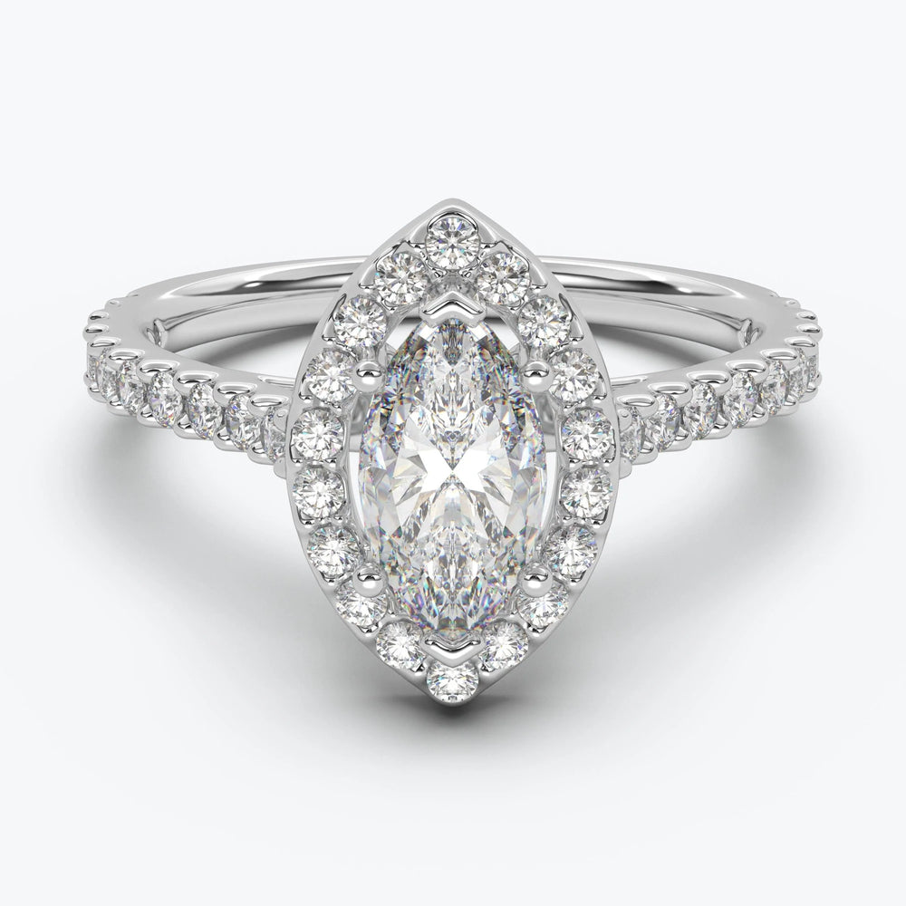 The Gabriel Marquise Halo rings feature a single marquise-cut diamond solitaire with a halo of smaller diamonds to enhance sparkle, and a diamond encrusted band which creates a refined view no matter which angle you view it from. The angular and 'spready' proportions of the marquise cut diamond serve to maximize the visual impact of this ring, and this is further amplified by the perfectly spaced out halo.