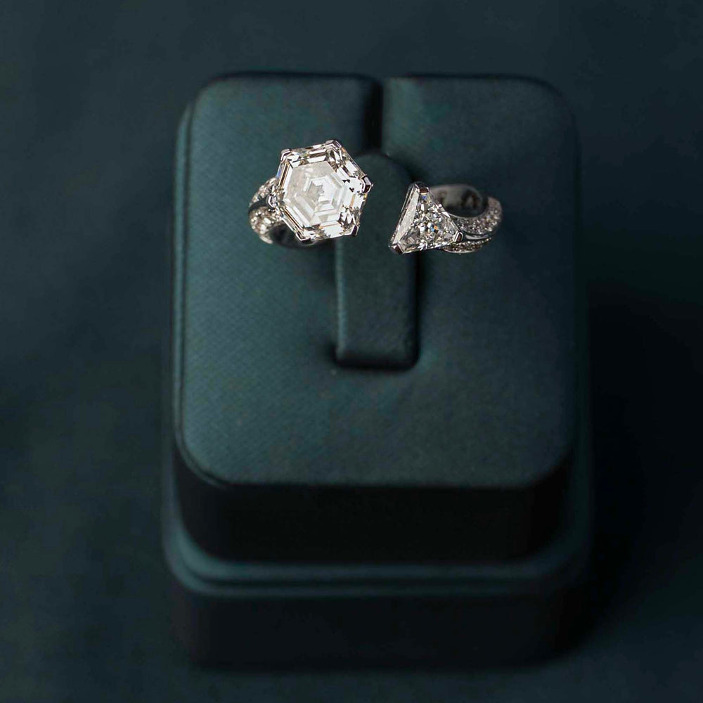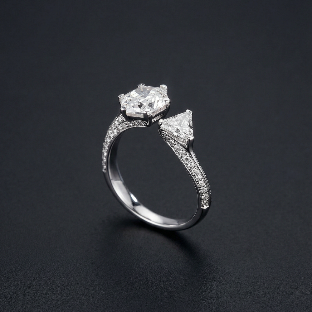 The Twin Spire is inspired by twin towers ascending toward light, a dialogue between structure and brilliance. A striking 2ct hexagon center diamond anchors the design with geometric strength, while a 0.6ct trillion-cut companion introduces motion and contrast, creating a silhouette that feels modern and edgy.